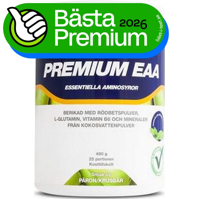 Premium EAA tillverkas i Sverige och varje burk innehåller 480 gram, vilket motsvarar 25 portioner á 19 gram vardera. Visst kan man inte förneka att priset per portion är högre än genomsnittet, med drygt 15 kr per portion. Men en svensktillverkad premiumprodukt kostar och vi tycker ändå att det rättfärdigar prislappen, särskilt om du har höga krav.