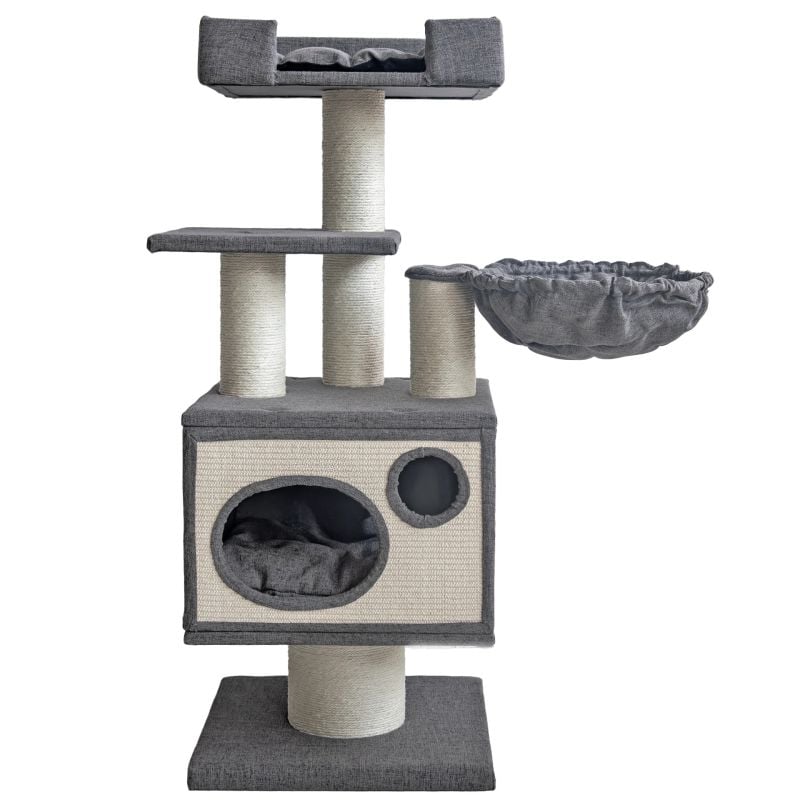 Utformningen av boet är dessutom väl genomtänkt. Tack vare att det finns två in- och utgångar kan flera katter använda det samtidigt utan att någon känner sig instängd eller trängd, något som bidrar till lugn och harmoni i hemmet. Den enda delen som sticker utanför basmåttet är hängmattan, som dessutom går att vrida för att passa olika utrymmen – praktiskt om man vill placera trädet i ett hörn eller mot en vägg.