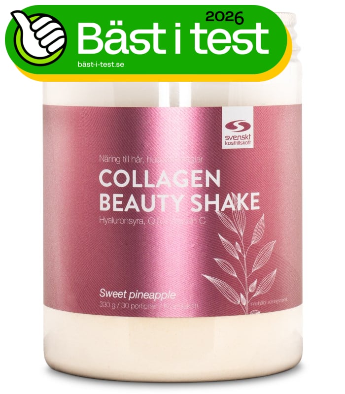 Från Svenskt Kosttillskott Beauty-serie hittar vi Collagen Beauty Shake. Det är ett tillskott innehållande inte bara kollagen utan även Q10, vitamin C och hyaluronsyra. Vitamin-C hjälper kroppen att stimulera kollagenbildningen och hyaluronsyra är en sockerart som hjälper till med att binda vätska i huden. Alla tre ingredienserna verkar i synergi och hjälper till att förbättra hud, hår och naglar. Den lilla antioxidanten Q10:s uppgift är att försöka få kroppens celler att inte åldras för snabbt.
