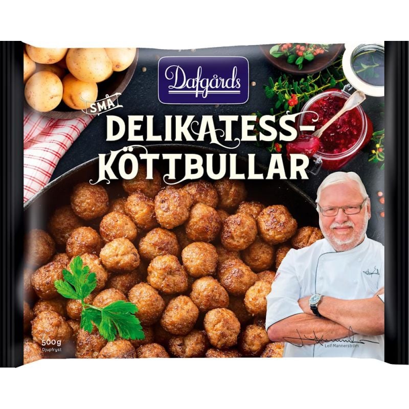 Dafgårds små delikatessköttbullar hittar man i frysdisken. Förpackningen rymmer 500 gram, vilket räcker bra till en middag för fyra personer. Med Mannerströms bild på förpackningen blir man förväntansfull, han är ju trots allt en av Sveriges mest namnkunniga kockar.