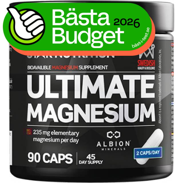Ultimate Magnesium är ett kosttillskott som innehåller magnesium från Albion minerals, vilket enligt Star Nutrition själva är en mycket välrenommerad leverantör av råvaror. Kapslarna har en mycket hög biotillgänglighet och innehåller både magnesiumcitrat och magnesiumbisglycinat. En förpackning räcker i 45 dagar och varje portion av två kapslar innehåller 235 mg elementärt magnesium vilket är riktigt bra.