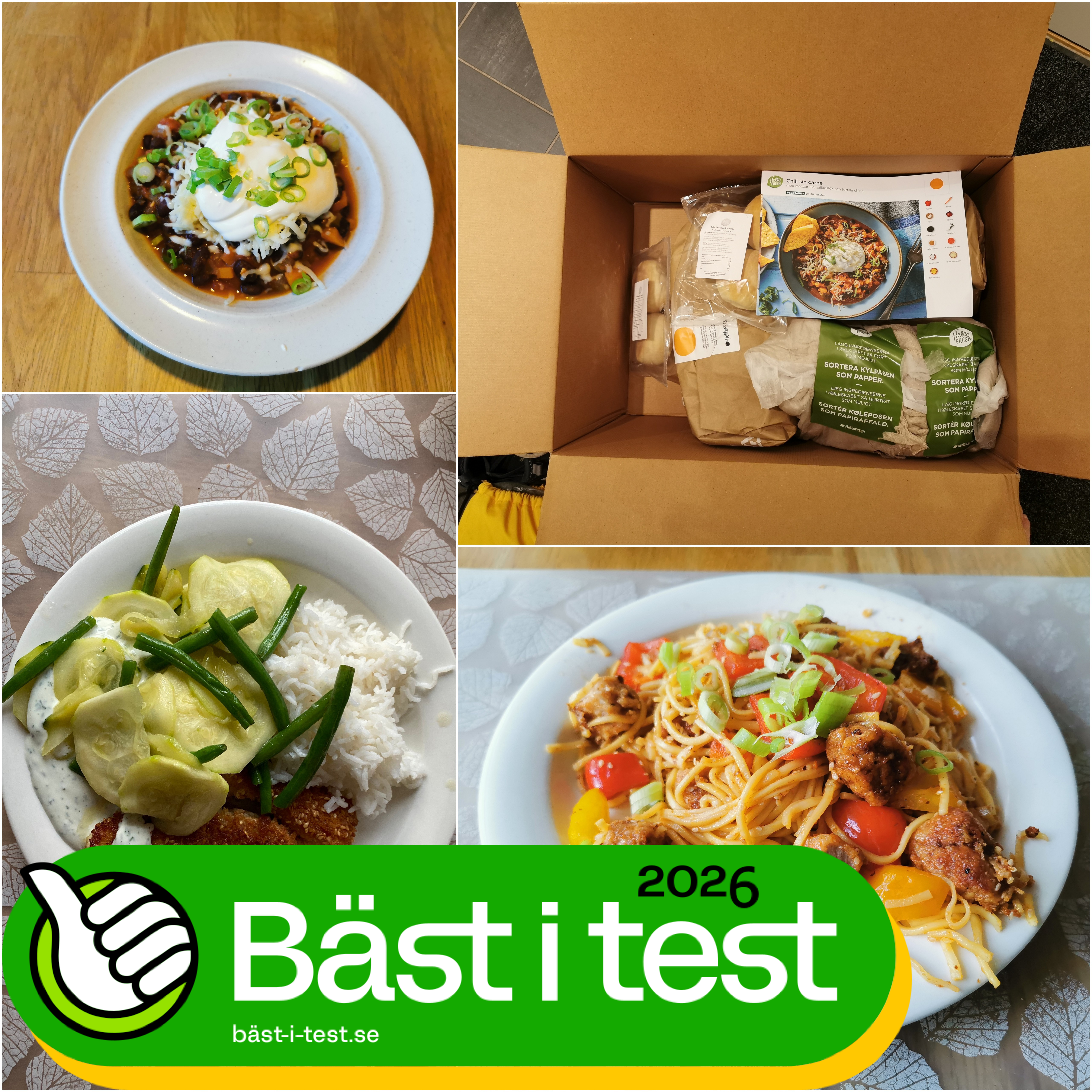 Maten: Hur är kvaliteten på de råvaror som levereras? Ingår allt som behövs? Hur väl varieras recepten och hur mycket grönsaker serveras?