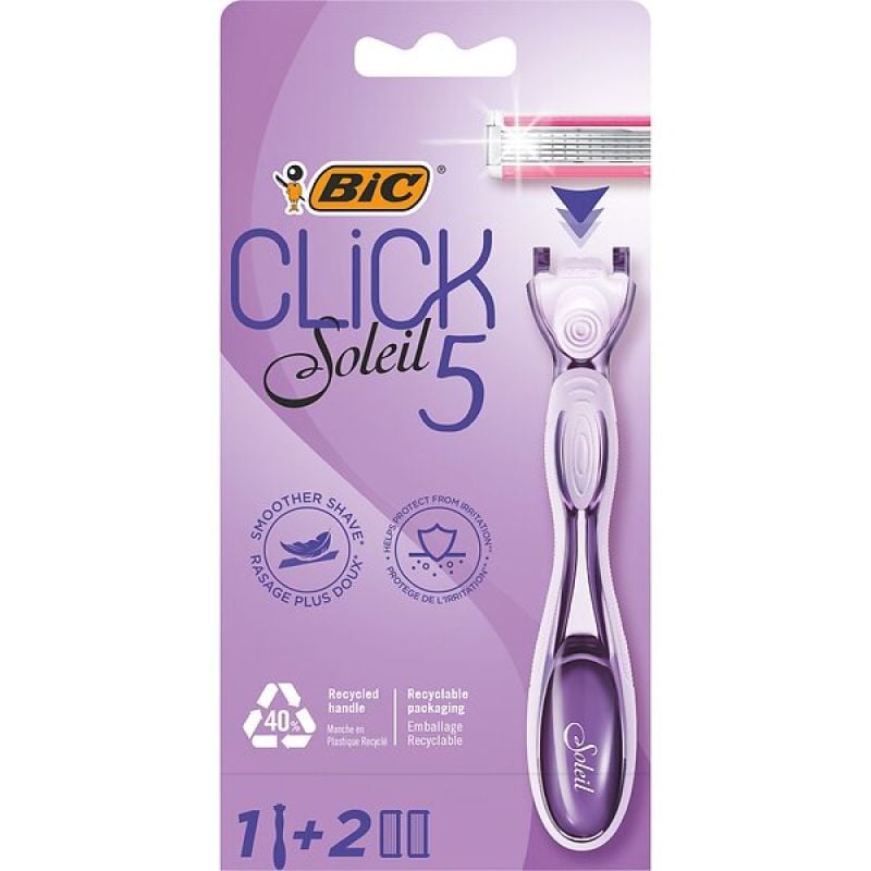 BIC Click Soleil 5 är en prisvärd rakhyvel av enklare modell, som ändå utför jobbet på ett mycket bra sätt. Köper man hyveln i ett startpaket medföljer för det mesta dels handtaget, dels två uppsättningar rakblad. Bladet fästs på handtaget genom att pressar handtaget mot rakbladets baksida. För att lossa ett använt rakblad trycker man bara in den runda knappen, så lossas spärren. Detta är enkelt och smidigt att göra, även med blöta händer.