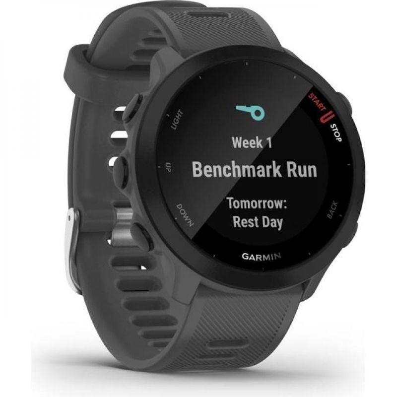 Detta är Garmins minsta, lättaste och billigaste GPS-klocka. Den finns i två modeller, en herrmodell och en dammodell som är så pass liten att den har bra passform på väldigt smala handleder. Det är också en av de användarvänligaste på marknaden och startar/stoppar med en enda knapp. Skärmen är tydlig och visar två rader med information samtidigt. Med pilknappen bläddrar man mellan tidtagning/distans, kaloriförbrukning/tempo samt klocka. Trots den låga prislappen finns ett antal funktioner som man annars bara hittar på dyrare modeller; Auto Paus stannar tiden vid rödljus, Virtual Pacer visar om du springer för snabbt eller sakta jämfört med din målsättning, Run/Walk gör att du kan skapa en löprunda med inplanerade gångpartier baserat på tid.
